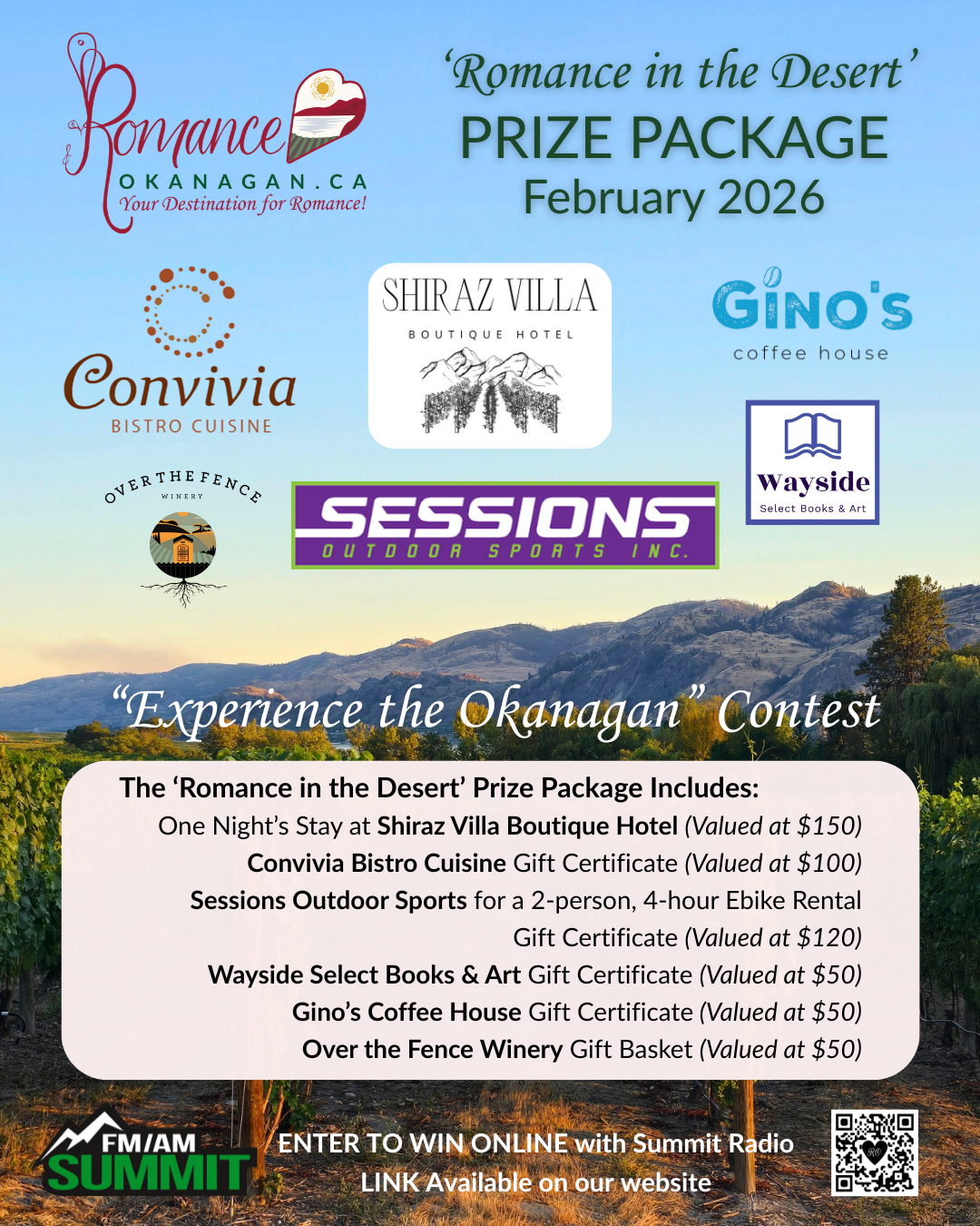 Romance Okanagan has partnered with some of the MOST Romantic Businesses in Osoyoos, BC to put together a ‘Romance in the Desert’ PRIZE PACKAGE for the Summit Radio February 2026 “Experience the Okanagan” Radio Contest. It might just be too much Romance for one weekend!